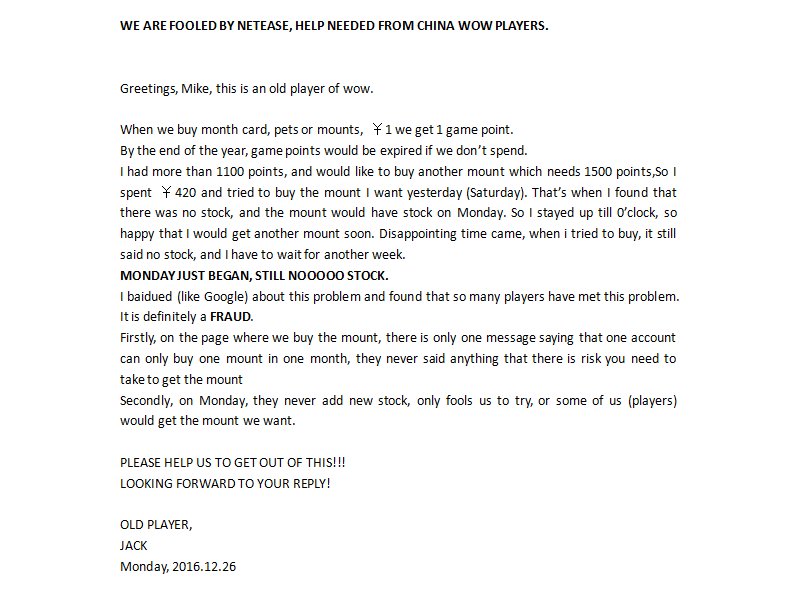 @Warcraft HI, Mike! HELP NEEDED FROM CHINA PLAYERS! NETEASE IS TRYING TO FOOL US. https://goo.gl/M9u4tk pic.twitter.com/Nc8LVO1BaS