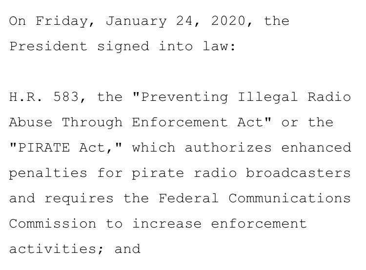 FYI: The PIRATE Act, re stopping illegal pirate radio operators harming listeners & broadcasters, is now law! Many to thank, esp: