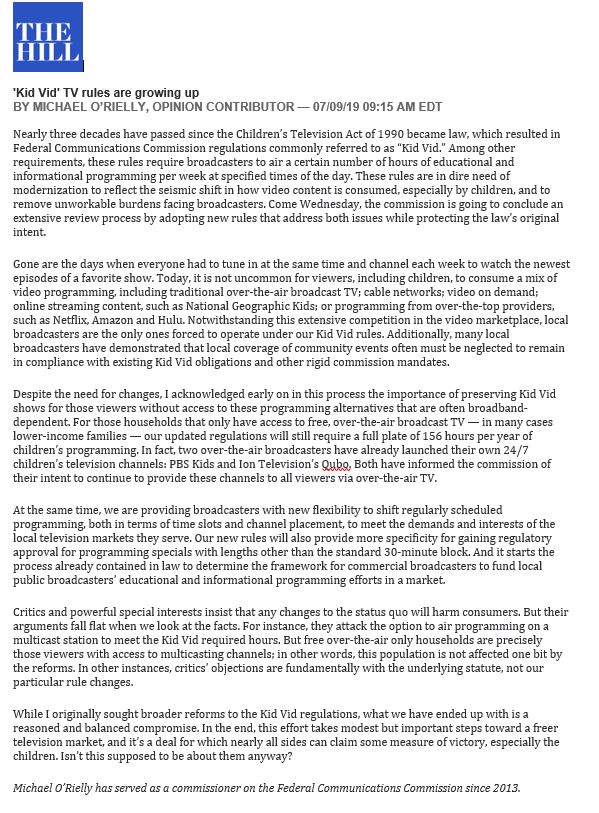 @thehill outlining process & direction re Kid Vid rules for tomorrow's@FCC Open Meeting. End product brings flexibility, modernizes rules, & protects children viewers. It's a moderate & balanced effort that everyone should support! https://thehill.com/blogs/congress-blog/technology/452064-kid-vid-tv-rules-are-growing-up …pic.twitter.com/4KZkQ9fifu