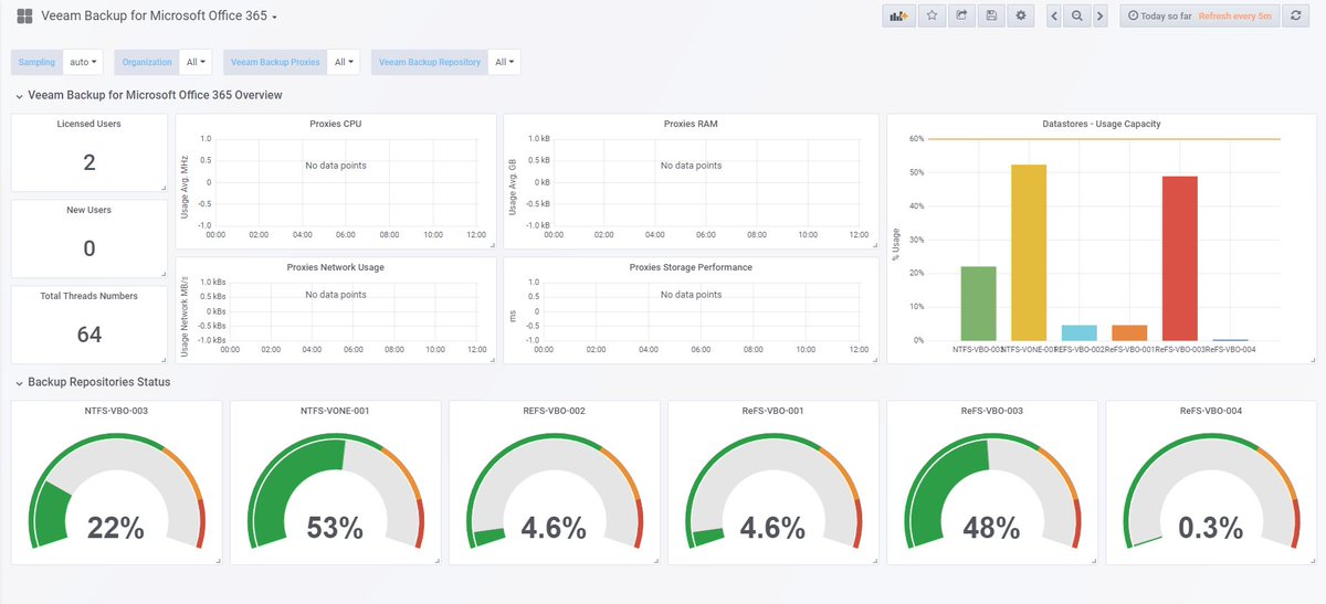 [Request for Feedback] Grafana Dashboard for Veeam Backup for Microsoft Office 365 it is about 50% completed (using 100% RestAPI), looking to hear from you about what do you want to see on a Dashboard for Veeam Backup for Microsoft Office 365, thanks!