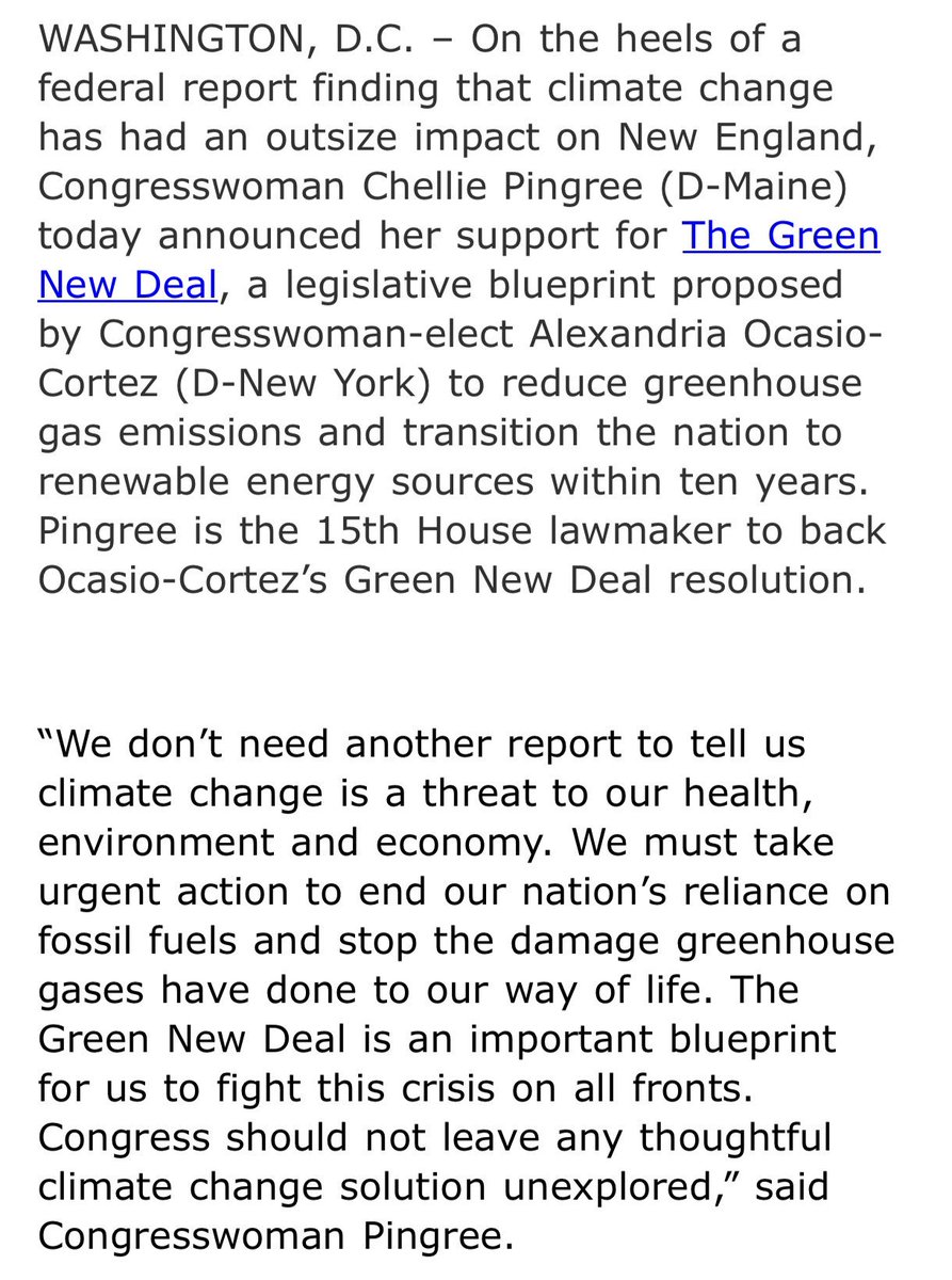@chelliepingree is the 15th House Democrat to announce support for@Ocasio2018’s “Green New Deal” resolution.#mepoliticspic.twitter.com/khsKPM36gm