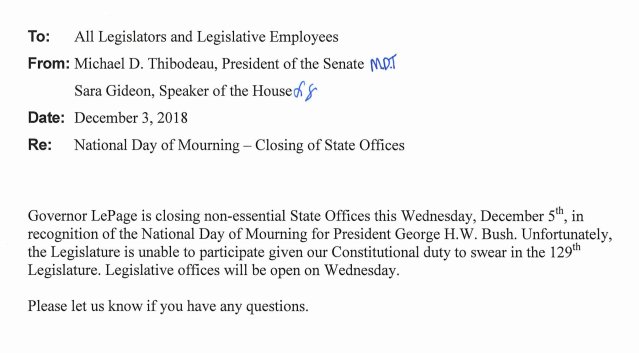 Reminder that the Maine Legislature constitutionally has to meet on Wednesday, so it'll be in even though executive branch offices are closed.