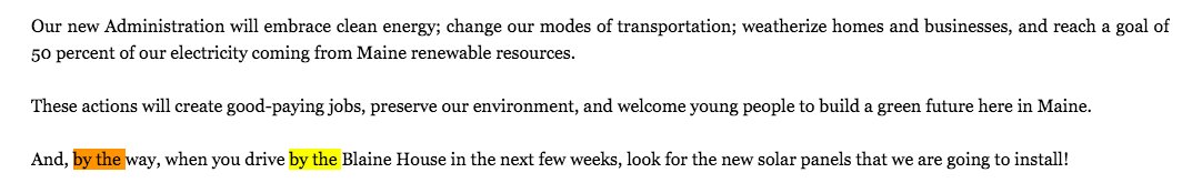 The first real policy pronouncement in the inaugural address: Mills wants to raise renewables standard from 40% to 50%.