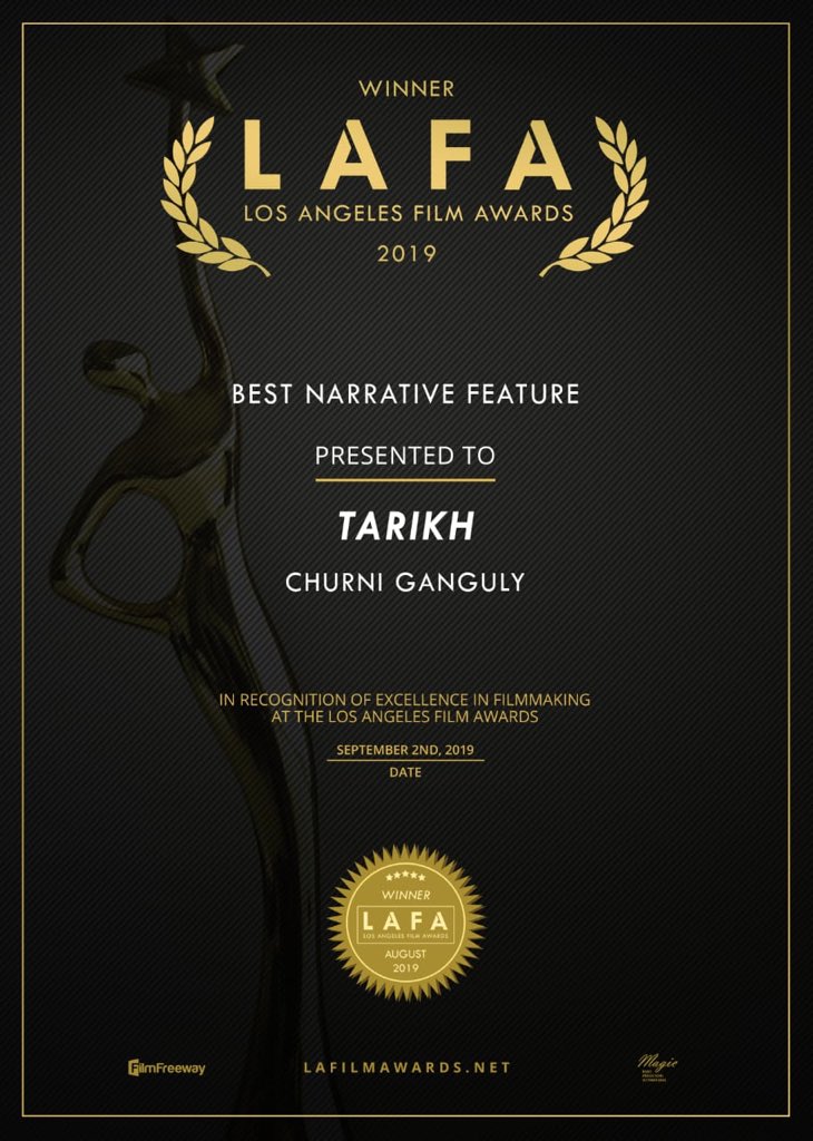 The Los Angeles Film Awards gives coveted awards to #TARIKH - #BestNarrativeFeature #BestEditor #BestSong Thank you @lafilmawards for these honours! This is truly a proud moment for my wonderful team. @SubhajitEditor @OperaMovies pic.twitter.com/VNleTNapoK