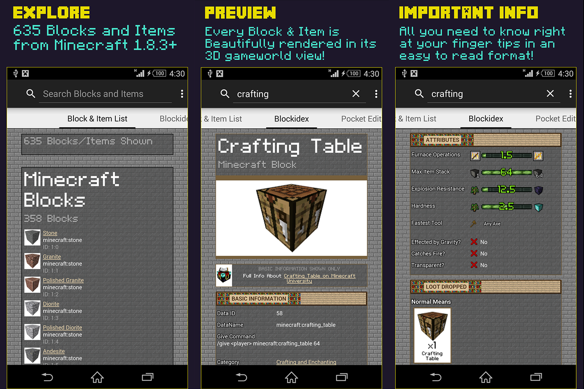 #Minecraft Guide for#Android that contains info for Blocks/Items in#MC https://play.google.com/store/apps/details?id=com.rarehaulstudios.blockidex …pic.twitter.com/7QgMLwEwBp
