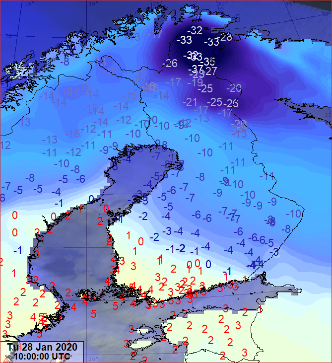 Lämpötilahavainto klo 12SA 28.1.2020. Ääripaikat: Ivalon lentoasema -36.5, Utö +4.7 astetta.