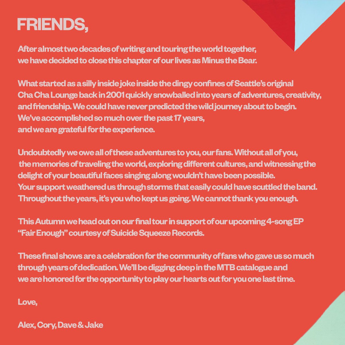 To celebrate the 1st anniversary of Fair Enough, we’ve partnered with @minusthebear to offer a free download of the EP today (10/19) from 12-5 pm PST exclusively through@Bandcamp! Link below. http://smarturl.it/MTB_FE