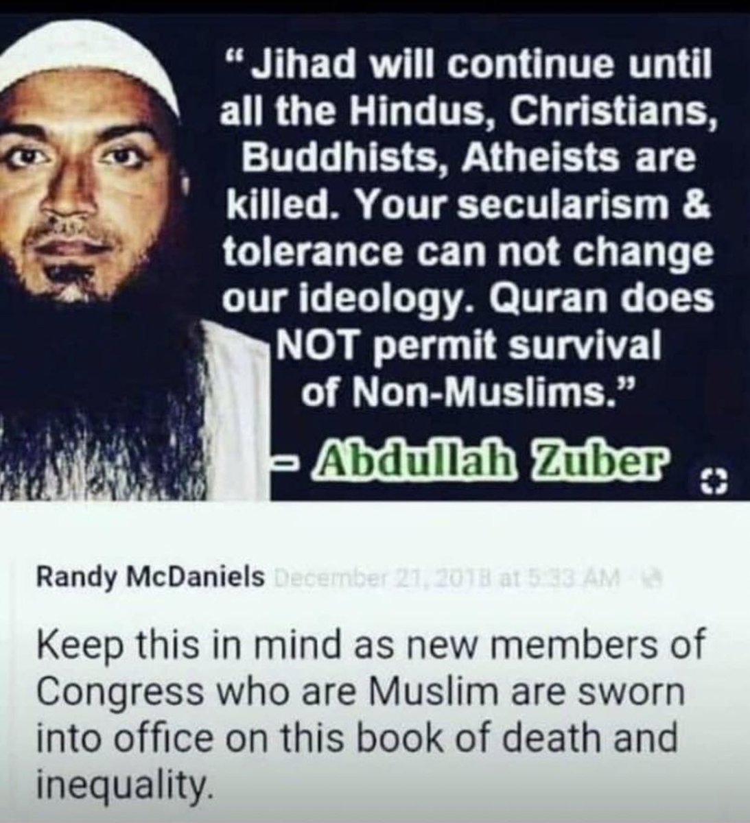 Keep this in mind as new members of Congress who are Muslim are sworn into office on the book of death and inequity.