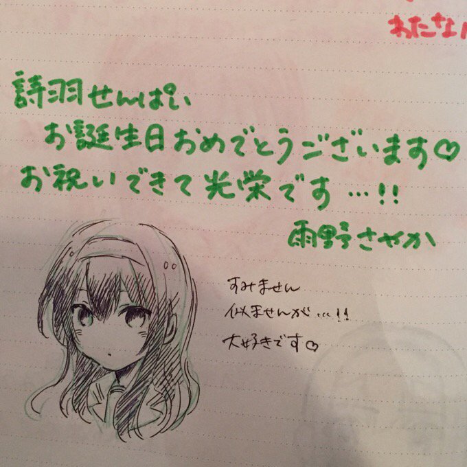 【詩羽先輩誕生日イベント@ノイタミナカフェ】武者サブ先生と雨野さやか先生がコミュニケーションノートに詩羽先輩を描いてくださったので皆様にお裾分け!(=´∀`)人(´∀`=) 発売中のビッグガンガン2016vol.03もよろしくです! pic.twitter.com/2zepxx6JMm