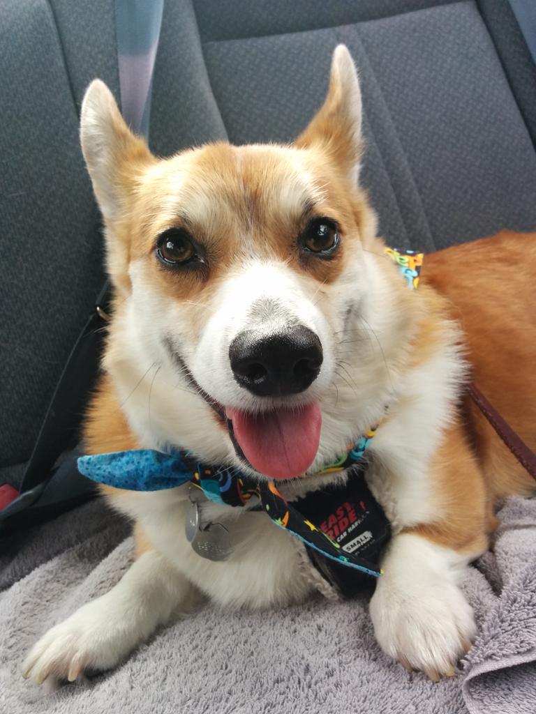 All strapped in! Ready for the road! Follow him on Instagram @threecheersforcorgis!! #birthdaydog @jenfujphotopic.twitter.com/ZJGs0AB0Td