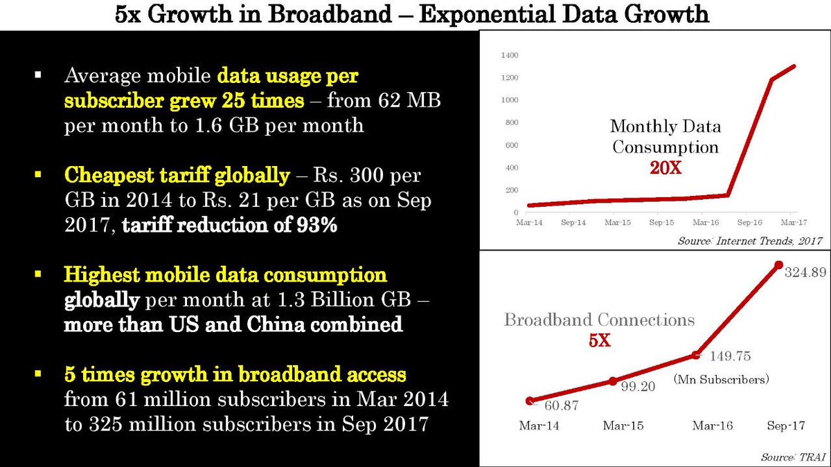 Truly Amazing! Data usage per subscriber in India has grown 25 times at the cheapest tariff globally. India has the highest mobile data consumption- more than US & China put together & there has been a 5 times growth in broadband access.pic.twitter.com/015tw5KBI6