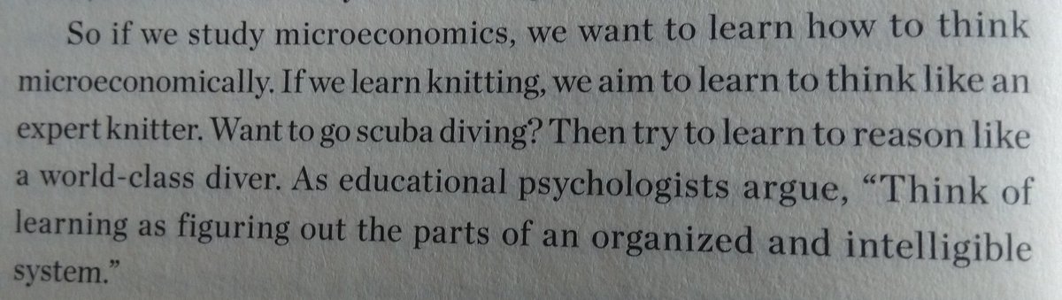 "So if we study microeconomics, we want to learn how to think microeconomically. If we learn knitting, we aim to learn to think like an expert knitter. [...] As educational psychologists argue, "Think of learning as figuring out the parts of an organized and intelligible system."