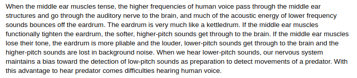 Trauma and auditory processing: Stephen Porges (polyvagal theory) writes about how people in fear states are more attuned to low frequency background noises (danger! lions! growling!) and less sensitive to the higher frequencies of human voice. 1/