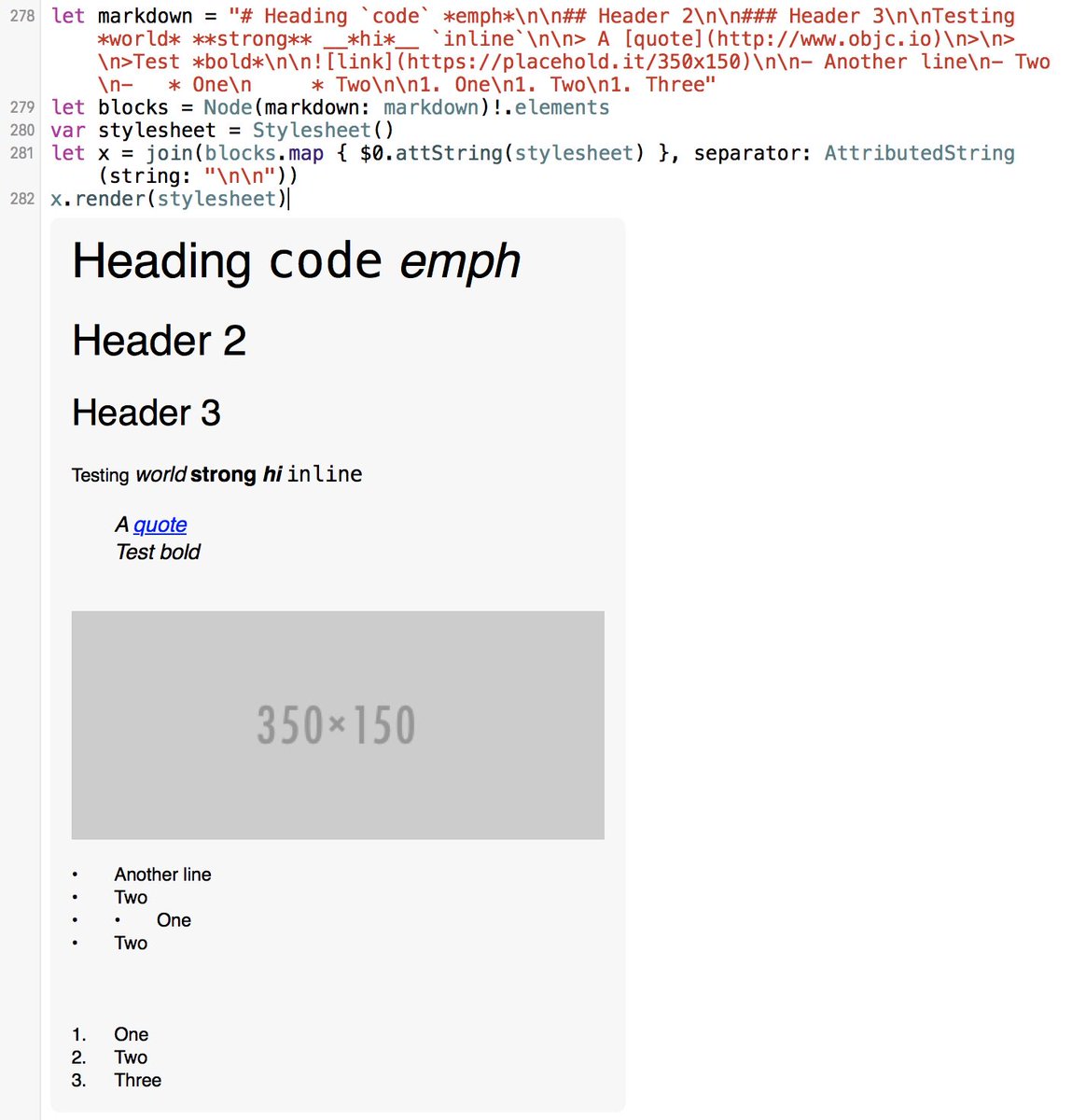 Today I used playgrounds to prototype CommonMark -> NSAttributedString. 80% done in a few hours!pic.twitter.com/hdJxjbPabn