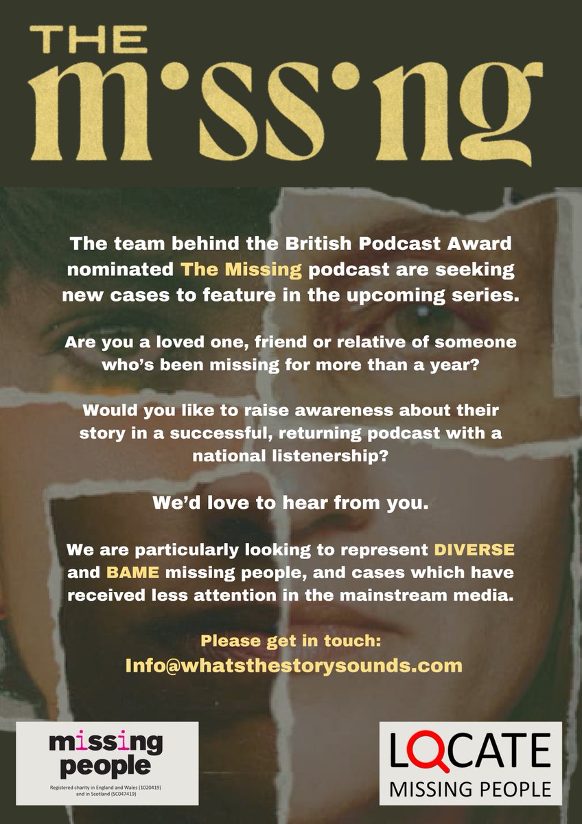 Are you a loved one, friend or relative of someone who has been missing for more than a year? Please email: info@whatsthestorysounds.com We are particularly looking to represent diverse & BAME missing people, and cases which have received less attention in the mainstream media.pic.twitter.com/erUftwai0v