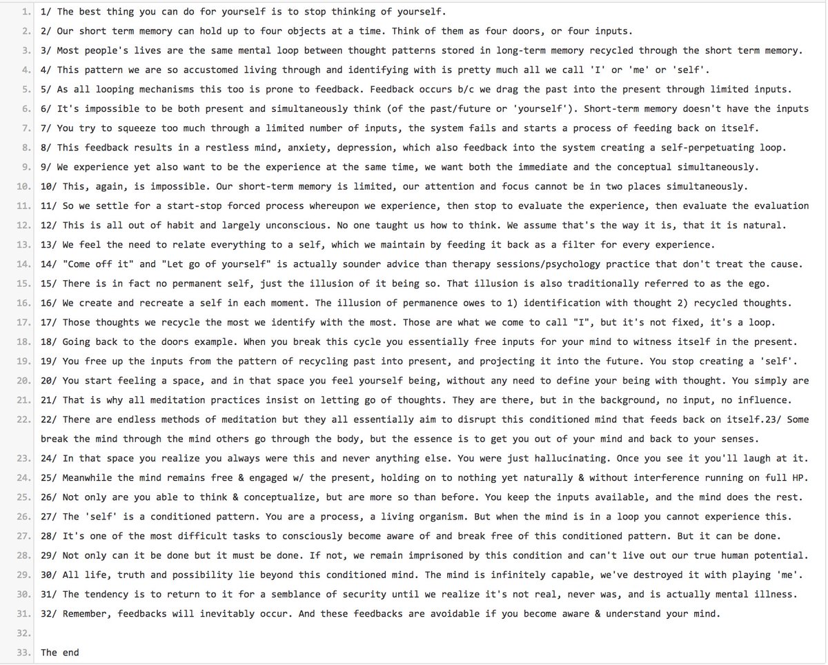 22/ There are endless methods of meditation but they all essentially aim to disrupt this conditioned mind that feeds back on itself.