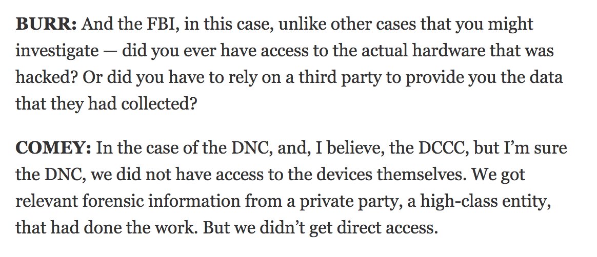 Comey reiterates that the FBI never gained primary access to the DNC's servers. Why isn't this point ever followed up on?pic.twitter.com/rojfqs7drb