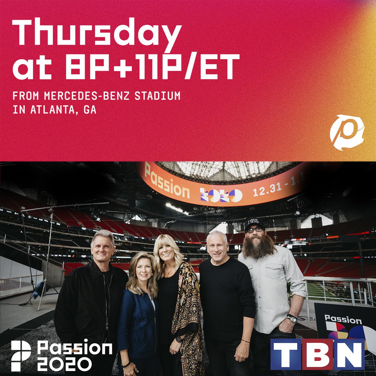 Join @louiegiglio,@shelleygiglio,@crowdermusic & Matt & Laurie Crouch from Mercedes-Benz Stadium as we look towards#Passion2020 & the new decade! This Thursday on@TBN at 8p + 11p/ET!pic.twitter.com/R07mNJGlLD