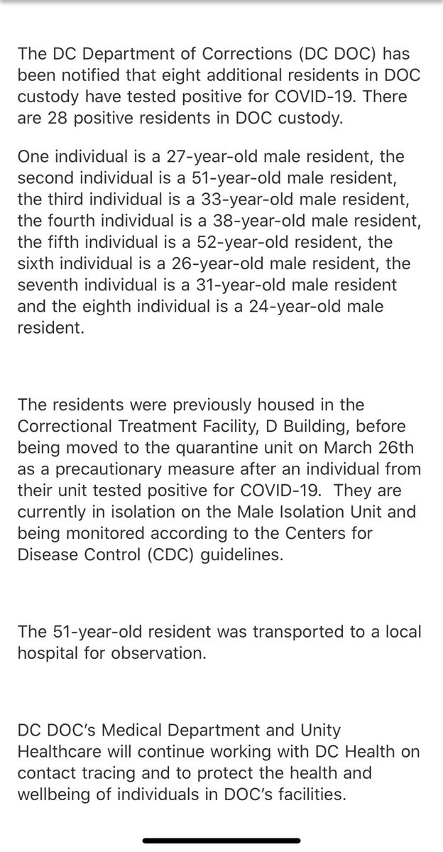 At 51-year-old inmate in the DC Jail was transferred to the hospital, the first inmate, as far as I’m aware, taken out of the facility for medical care related to COVID-19. DOC announced eight new cases today, for a total of 28 inmates who tested positive.pic.twitter.com/QvYv7O2V9d