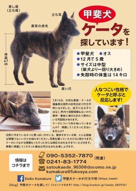@itaya_kaede 様#拡散希望RT#迷子犬#甲斐犬#福島県只見町の自宅付近から行方不明 2016年3月16日から必死に探しています。 人懐こく甘えん坊な男の子 水色の首輪と青のロープリードを着けていました。 遠方にいる可能性あり。目撃情報等お知らせください