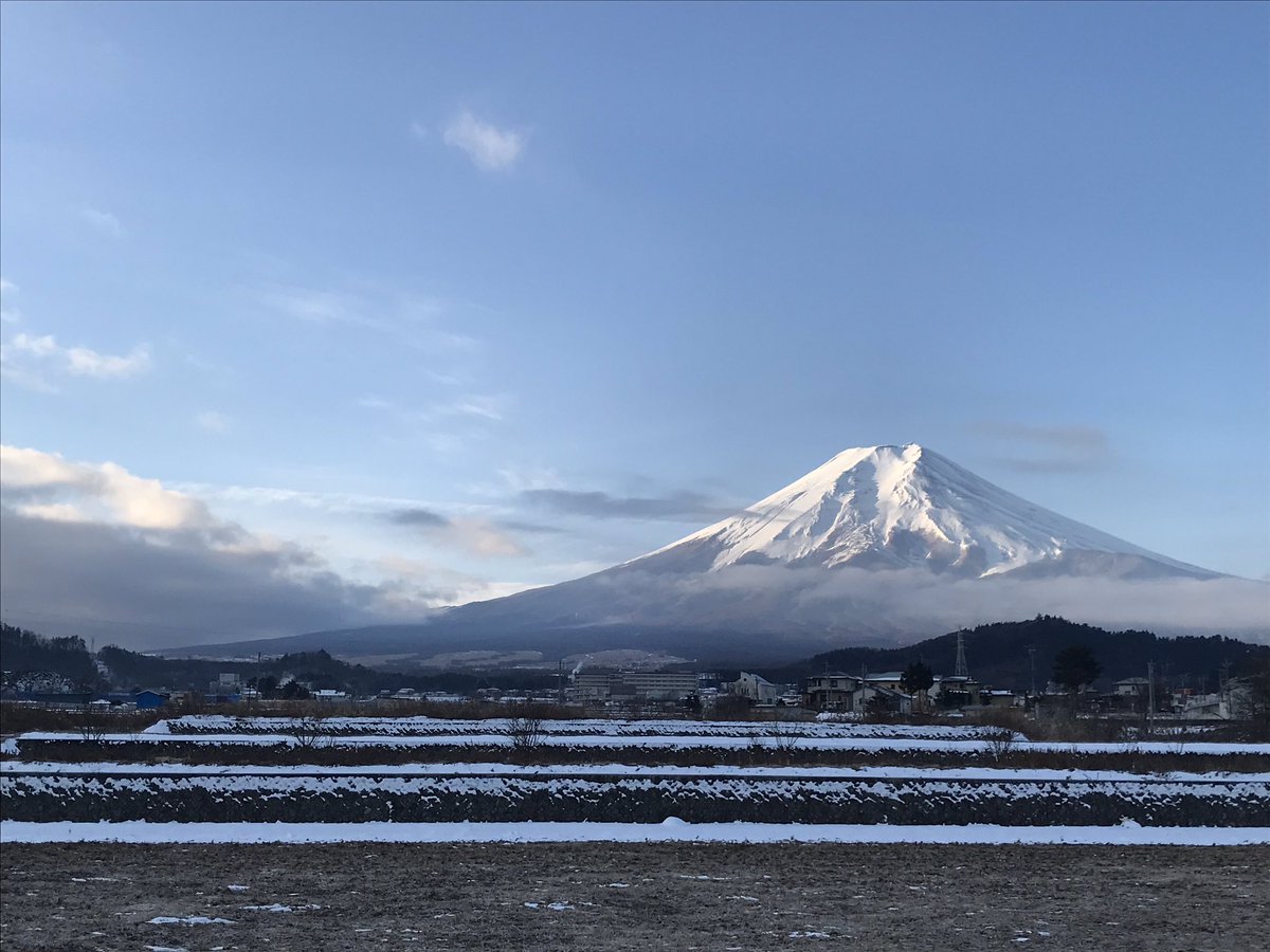 富士吉田からの富士山 1/30朝 今朝は久しぶりに快晴。気温は1℃あるけど風が強くて寒く感じる。