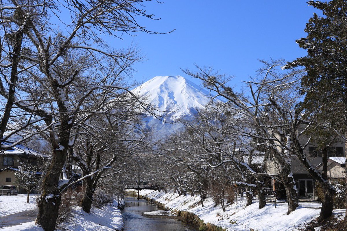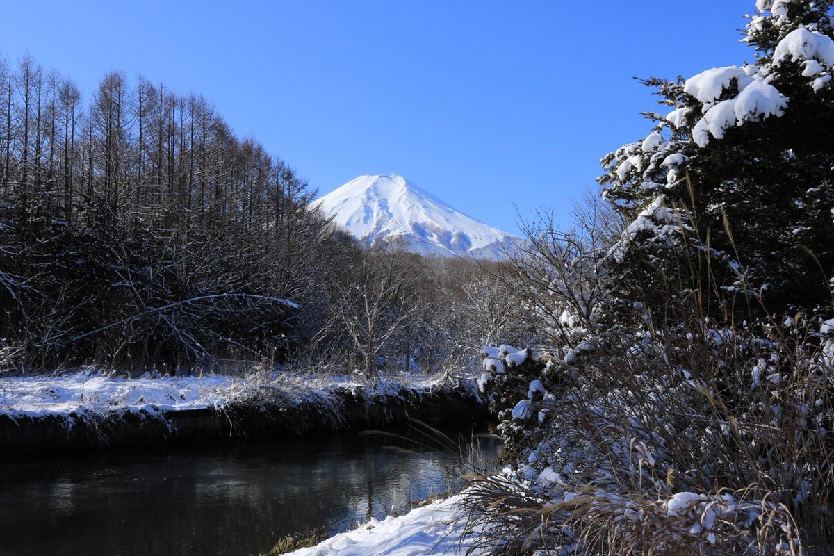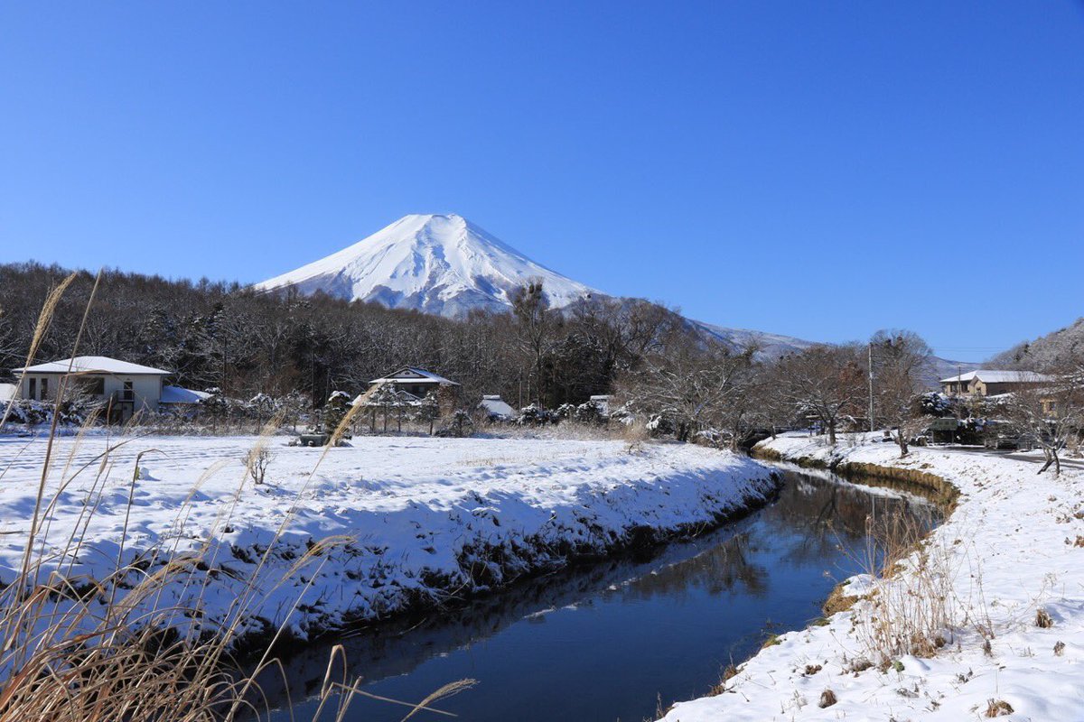 雪景色の新名庄川沿いからの富士山 1/19朝 忍野からも撮ってみた。陽が当たる側の川沿いは雪が薄くて地表が見えていた。