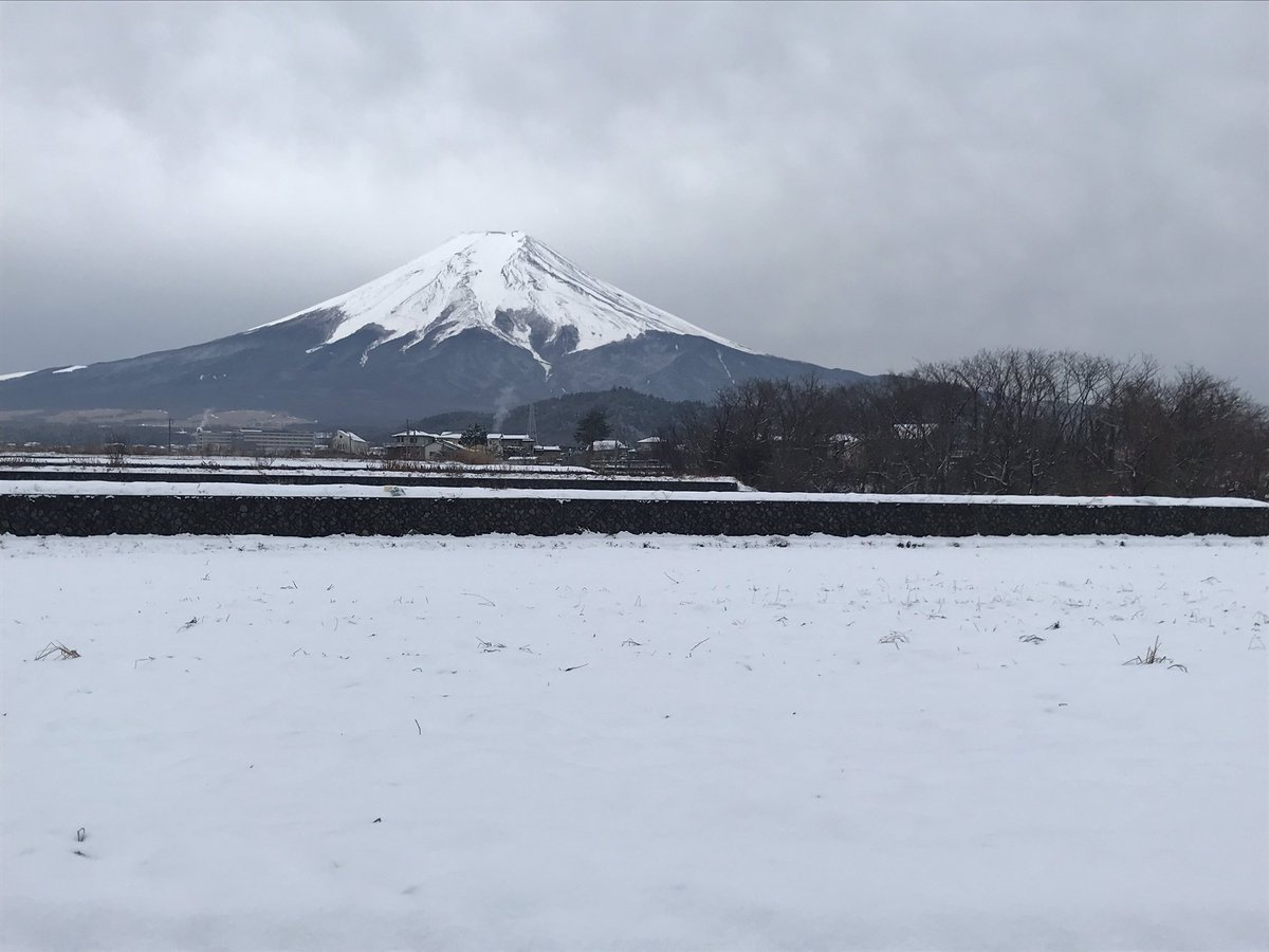 雪景色の忍野からの富士山 1/19朝 今日は朝から雪が降っていて今で5cmぐらい積もっている。富士山は見えないので、先週忍野の新名庄川沿いからデジイチで撮ったを4枚アップ。