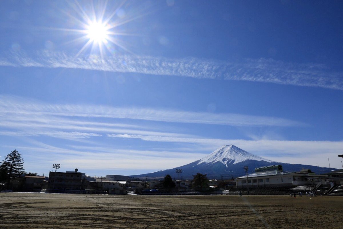 富士吉田からの富士山 1/21朝 今朝は快晴。グランドの雪はほとんど無くなって、陽のあたらない所に少しだけ残っている。