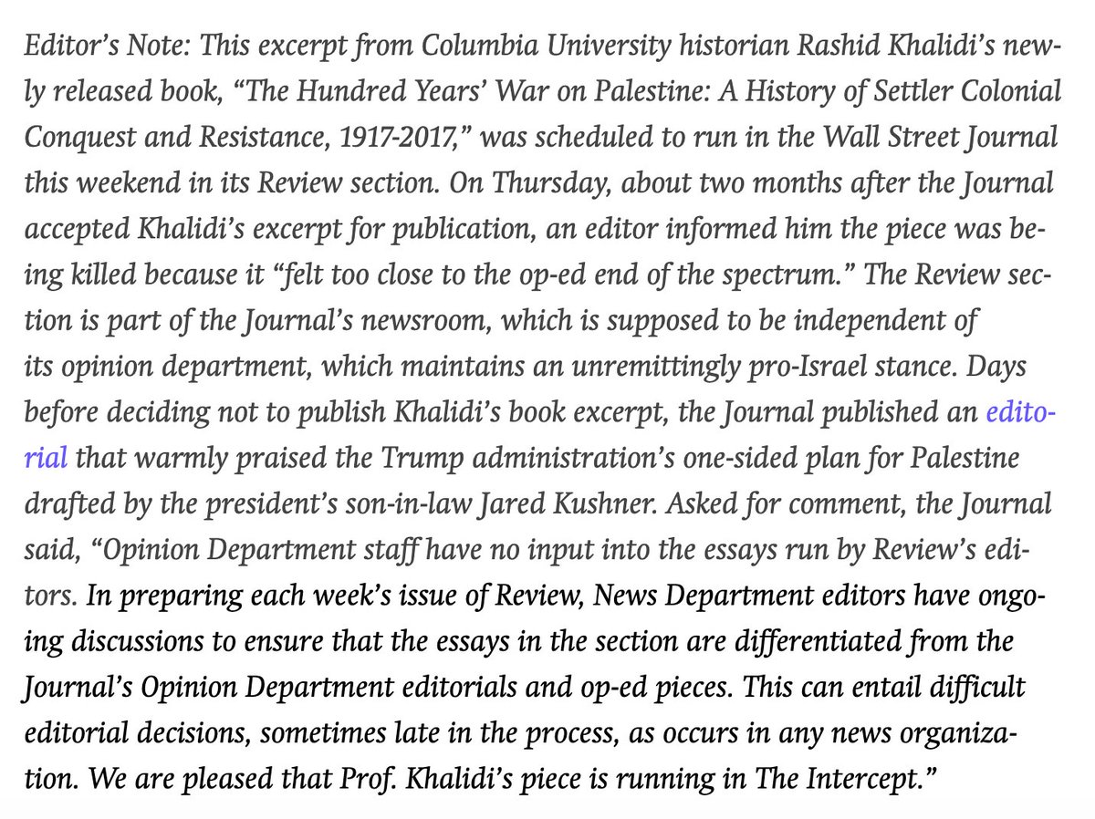 This excerpt from historian Rashid Khalidi's new book, "The Hundred Years' War on Palestine," was supposed to appear in the Wall Street Journal today. But the Journal abruptly decided not to publish it at the last minute, so we ran it instead. https://theintercept.com/2020/02/01/hundred-years-war-palestine-book-rashid-khalidi/ …pic.twitter.com/uPuXfKxKXq