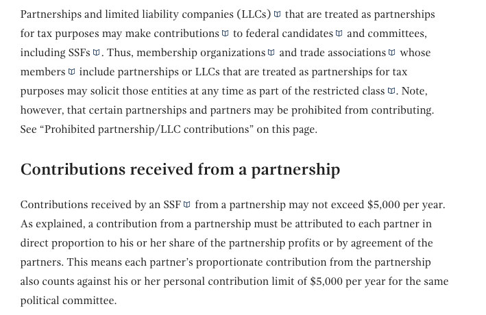 Bottom line: Partnerships and LLCs cannot be used to evade contribution limits to candidates, parties, and PACs — which is why @FEC requires the living, breathing humans behind these corporate structures to be disclosed. See more from #FEC here https://www.fec.gov/help-candidates-and-committees/taking-receipts-ssf/contributions-by-partnerships-and-llcs-to-ssfs/ …pic.twitter.com/v5zuWBKERY
