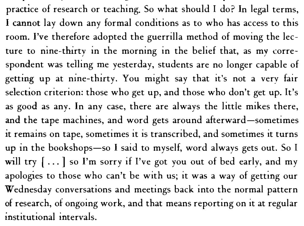 Michel Foucault's solution to the problem of too many students turning up to his lectures, which because of his position at the Collège de France were legally open to anyone and couldn't be limited: with some apologies, moving lectures to the unreasonably early hour of 9:30am.pic.twitter.com/okSRnafyCL