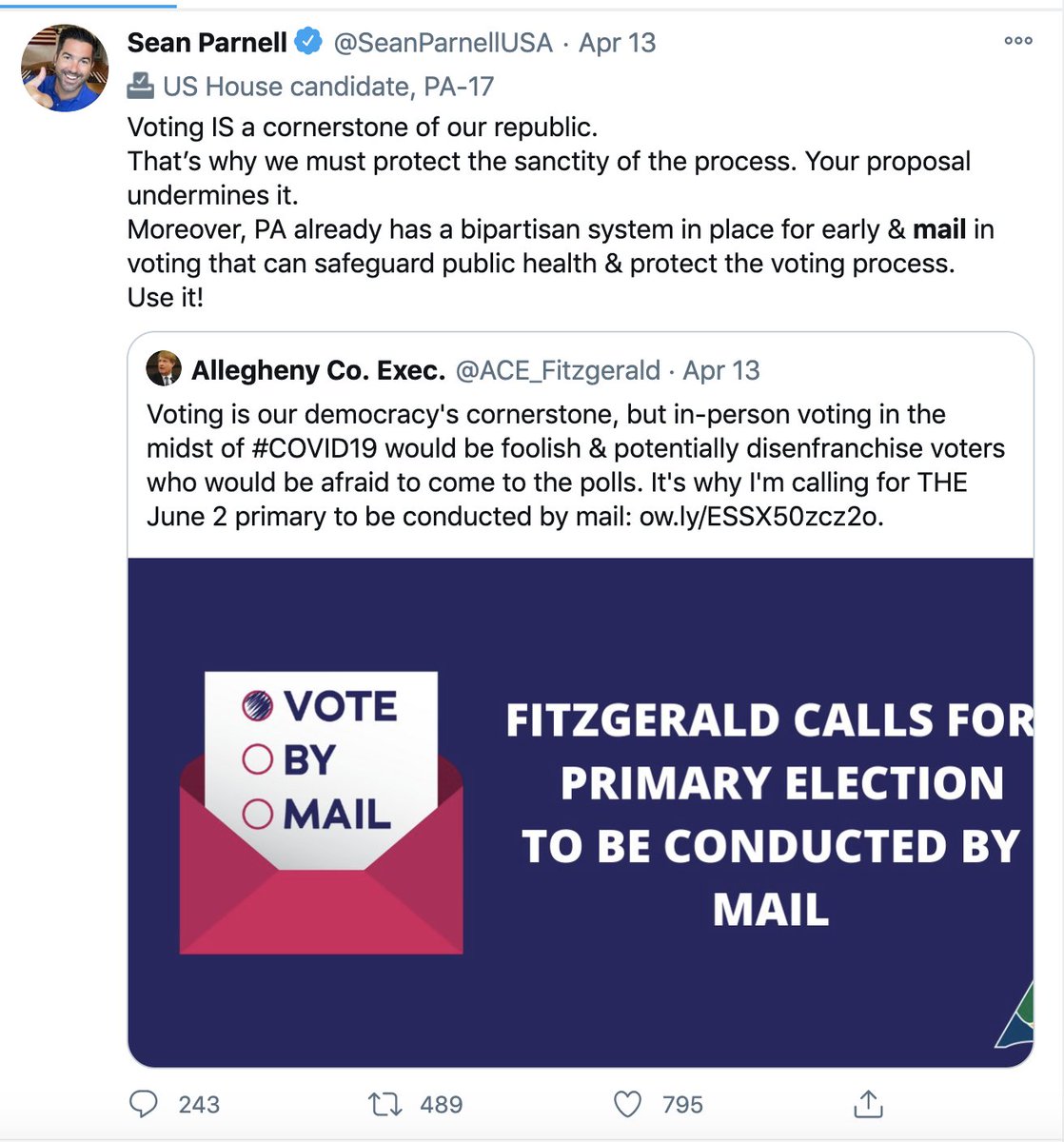 One GOP candidate in PA who lost, suing to throw out millions of mail-in votes previously encouraged his supporters to vote by mail and absentee if they didn't feel comfortable going out in public and praised the state's mail-in voting system. https://twitter.com/SeanParnellUSA/status/1330319169687007237 …pic.twitter.com/p8OkOh5h95
