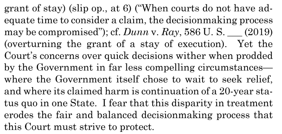 A remarkable accusation for a justice to lob against her colleagues. And tragically accurate. https://www.supremecourt.gov/opinions/19pdf/19a905_7m48.pdf …https://twitter.com/stevenmazie/status/1231012807891513344 …