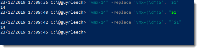 #regex with -replace in#PowerShell as well as with -match. "vmx-14" -replace 'vmx-(\d*)$', '$1' Extracts just the end digits from the string where $1 represents the 1st matching group. Note quote mark type/escape of $pic.twitter.com/lg7WyJcNIx
