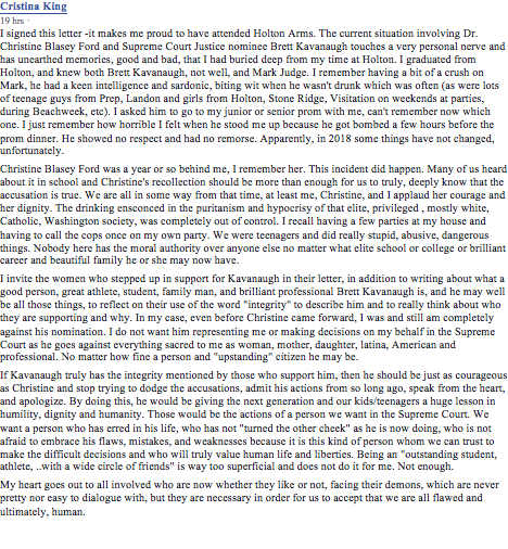 Here's a letter from a woman that went to school with #ChristinaBlaseyFord and knew @BrettKavanaughpic.twitter.com/IPSCq1IbKp