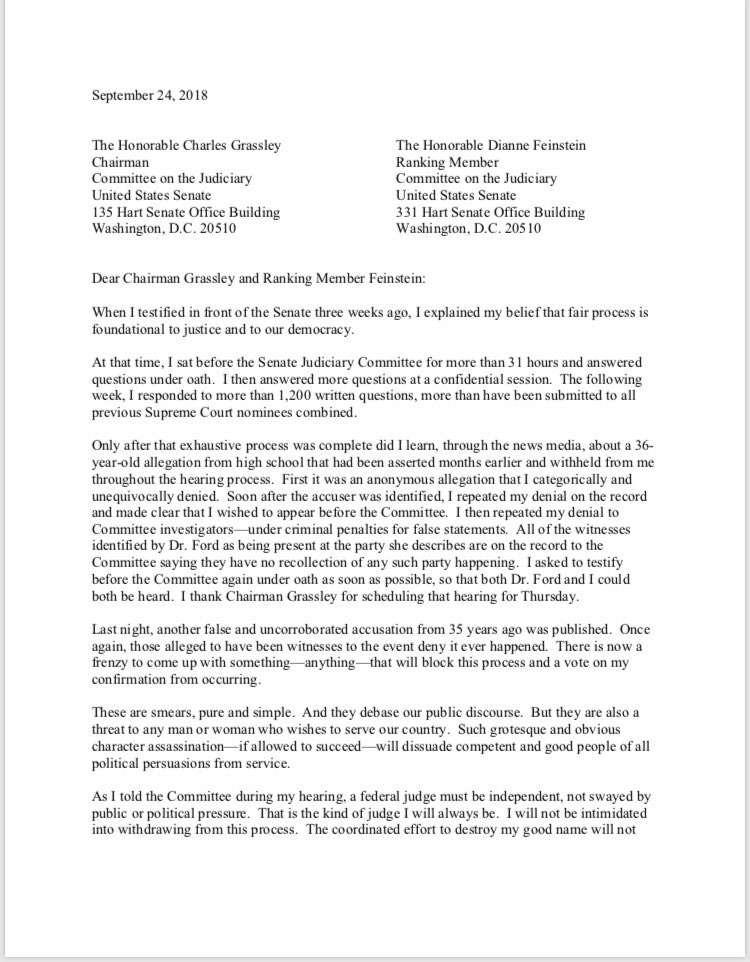The whiff of hypocrisy and entitlement is strong in this letter. If he truly believes “that fair process is foundational to Justice and to our democracy” he wouldn’t be taking part in a *he said/she said* hearing, and would instead be demanding an independent investigation