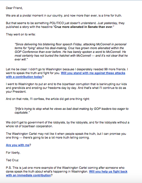 .@TedCruz vs. Politico, part 85. He's now fundraising off this @mkraju/@burgessev story. | http://www.politico.com/story/2015/07/ted-cruz-more-alienated-in-senate-than-ever-120749.html …pic.twitter.com/Q1xKuEaZxQ