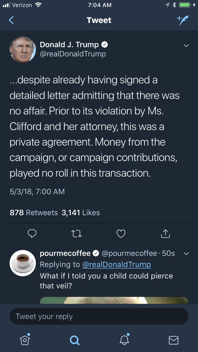So Trump lied about knowing about the payment and paying it back, but he's telling the truth about not having sex with Stormy, okay? Okay!pic.twitter.com/2Z9aBnEp4E