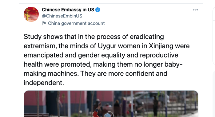 The Chinese Communist Party's chauvinism and racism towards Uyghurs knows no limit. Let’s call this what it is– cultural eradication through forced abortion, forced sterilization, unjust imprisonment, and torture.pic.twitter.com/BSECgHRA5L