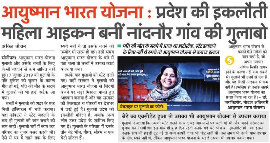 @narendramodi जी द्वारा शुरू की गयी#AyushmanBharat योजना गरीबों के लिए वरदान साबित हो रही है। सोनीपत के नांदनौर गाँव की गुलाबो को हार्ट अटैक के बाद#PMJAY के माध्यम से निःशुल्क रूप से हृदय में स्टेंट पड़ने के बाद अब वो सुचारू रूप से अपना जीवन जी रही हैं।pic.twitter.com/VSHw3qrCeT