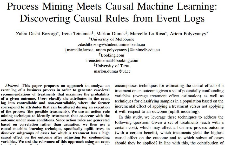 #icpm2020 paper "#ProcessMining meets Causal#ML" shows how to discover rules of the form Precondition, Treatment→Outcome to increase the success rate of a business process by triggering an action when a condition holds https://arxiv.org/abs/2009.01561 w/@uartem@mlr80 et alpic.twitter.com/auQFWNvPY5