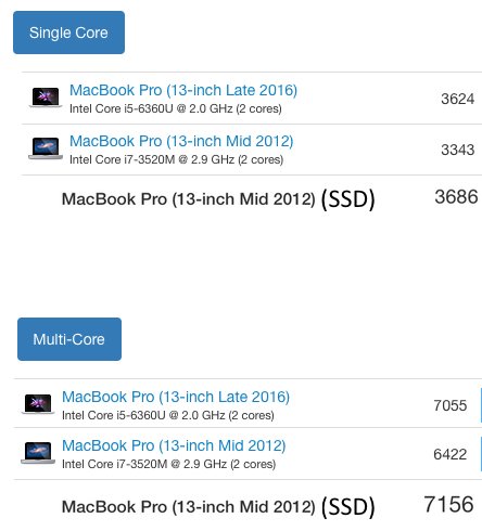 My 2.9GHz i7 MacBook Pro 2012 with an SSD belts out better single and multi core Geekbench scores than the new 2016 non Touch Bar model.