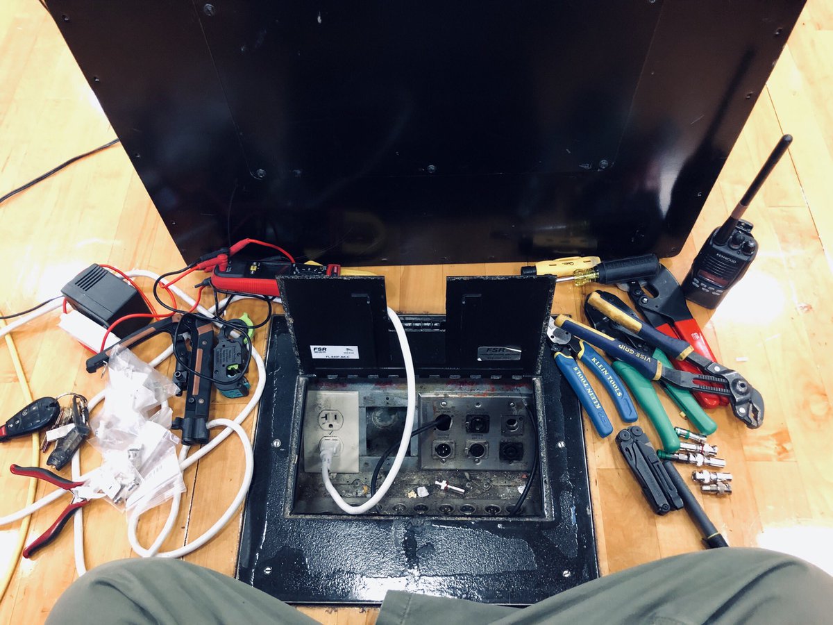 People keep asking me, “What’s a Media Grease Monkey?” Refer to the pic. 5 feet away from inbound line at Mustang Madness 2019, tools everywhere, trying to fix camera cables underneath the floor, all while a game is happening right in front of you.