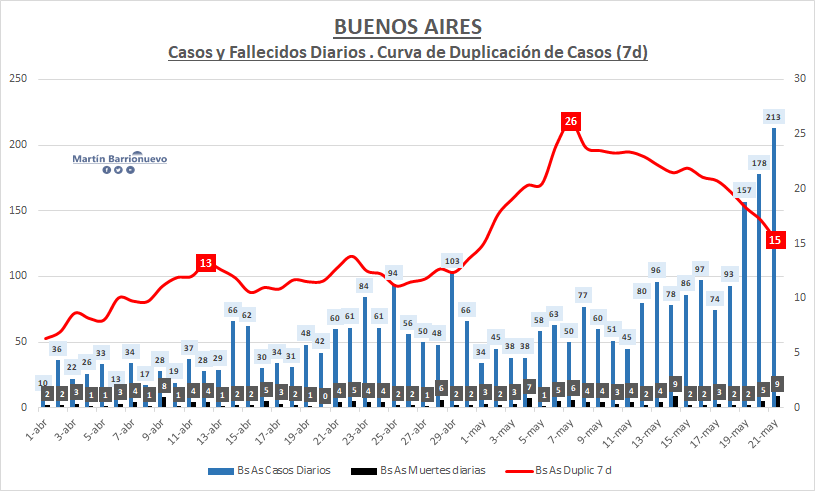 Indicadores 21-05 648 casos (+7.2%;el mayor incremento % diario desde el 14 de abril). 13 Fallecidos (1 a la mañana y 12 a la noche) CABA 379 casos (58,5% de los casos de hoy) Buenos Aires 213 (32.9%) Lo verde cada vez más verde, lo rojo cada vez más rojo.pic.twitter.com/GRcl4kxfKx