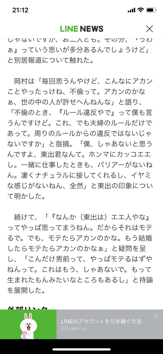岡村きっしょ… 東出擁護する要因なんてないのに…え… きもい… 夫婦の問題なのはわかるけど 「こんなにあかんことやっけ不倫」 え????こいつ最初から最後まで東出擁護してかっこいいから仕方ないって、、、え??世の中の男舐めすぎでしょ。かっこよくても不倫しない人間もいるわ。pic.twitter.com/ru4x3J8Jyz