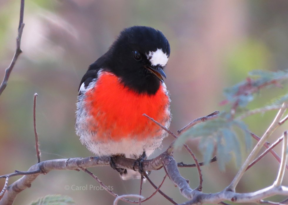 Ridiculously red-breasted male Scarlet Robins have been popping up lately around here. The black throat and large white forehead spot distinguish him from the Flame Robin, which is much harder to find these days.