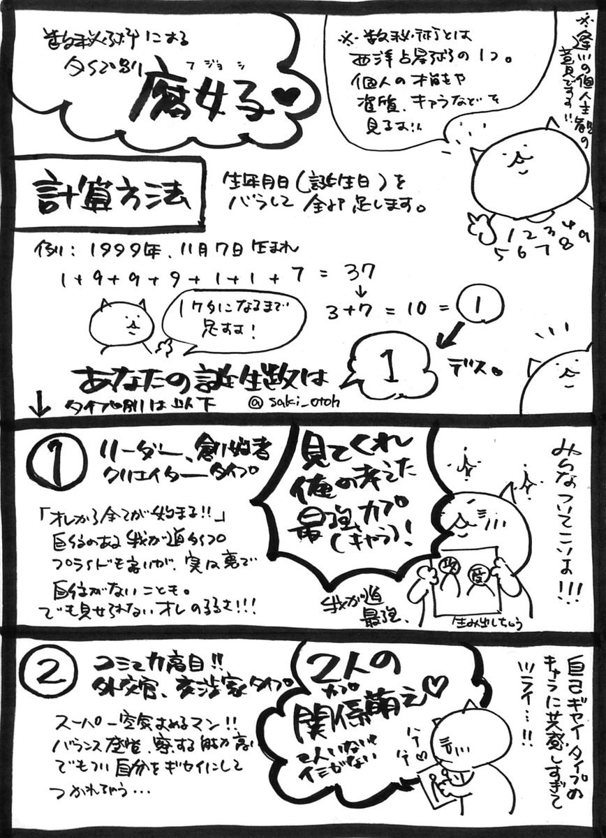 「数秘術」の番号タイプ別 「腐女子の傾向」を描いてみたよ( ˘ω˘ ) ※独断と偏見に基づきます 生年月日をバラバラにして全部足して 一桁になるまで足したら「何番」でしたか? 「11、22、33」はマスターナンバーpic.twitter.com/pieqXxR9pD