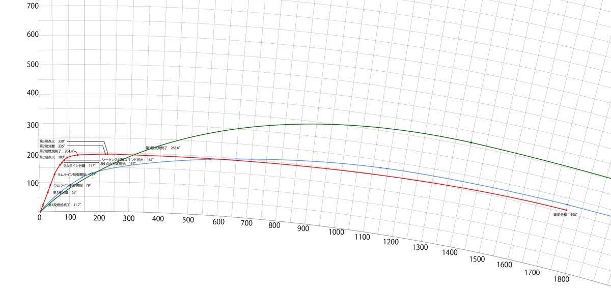SS-520-4号機(赤)とイプシロンロケット2号機(青) L-4S-5ロケット(おおすみ(緑)のトラジェクトリの比較です。L-4S-5は概算です。pic.twitter.com/wfTZie1P6M