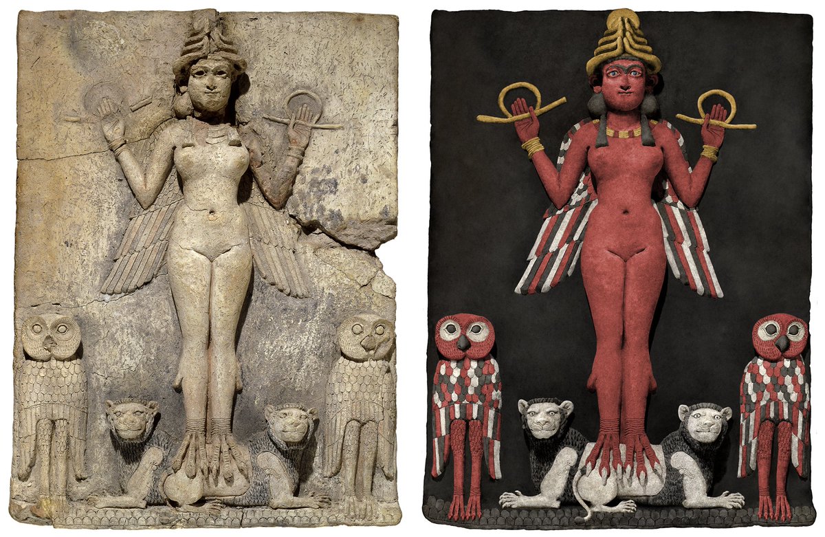 This relief is known as ‘The Queen of the Night’. Made in Babylonia between 1792–1750 BC, it may depict Ishtar, goddess of sexual love and war. There are still traces of paint on the sculpture – this reconstruction shows what it may have originally looked like. pic.twitter.com/PsP7PatjVF