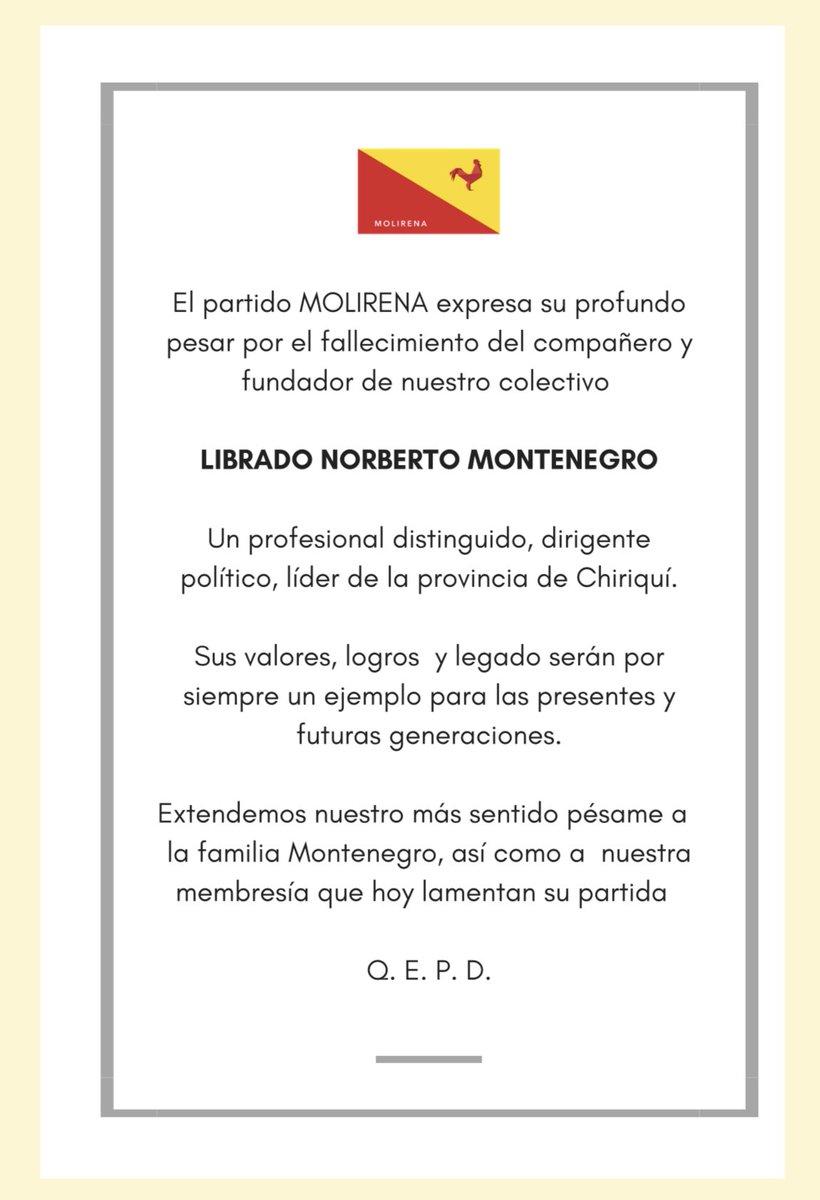 @molirenaoficial pasa por la pena de informar el fallecimiento de nuestro dirigente fundador Librado Montenegro. Nuestra organización acompaña a la familia Montenegro en tan difícil momento.pic.twitter.com/Sy0Lid1FRk